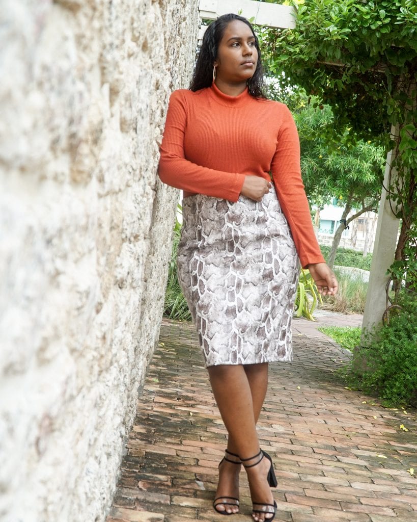 The main feature of this skirt I would say is the double ended zipper in the back. I used a white zipper with gold hardware and it is absolutely gorgeous with the snake print! You use the zipper to adjust the slit in the back… genius!! So if you’re heading to a more conservative event, you can leave it zipped all the way down and no worries there is enough space for walking and bending freely with no slit unlike some other pencil skirts. But if you want to add a little spice or drama, you can undo the zipper as far as you want.
