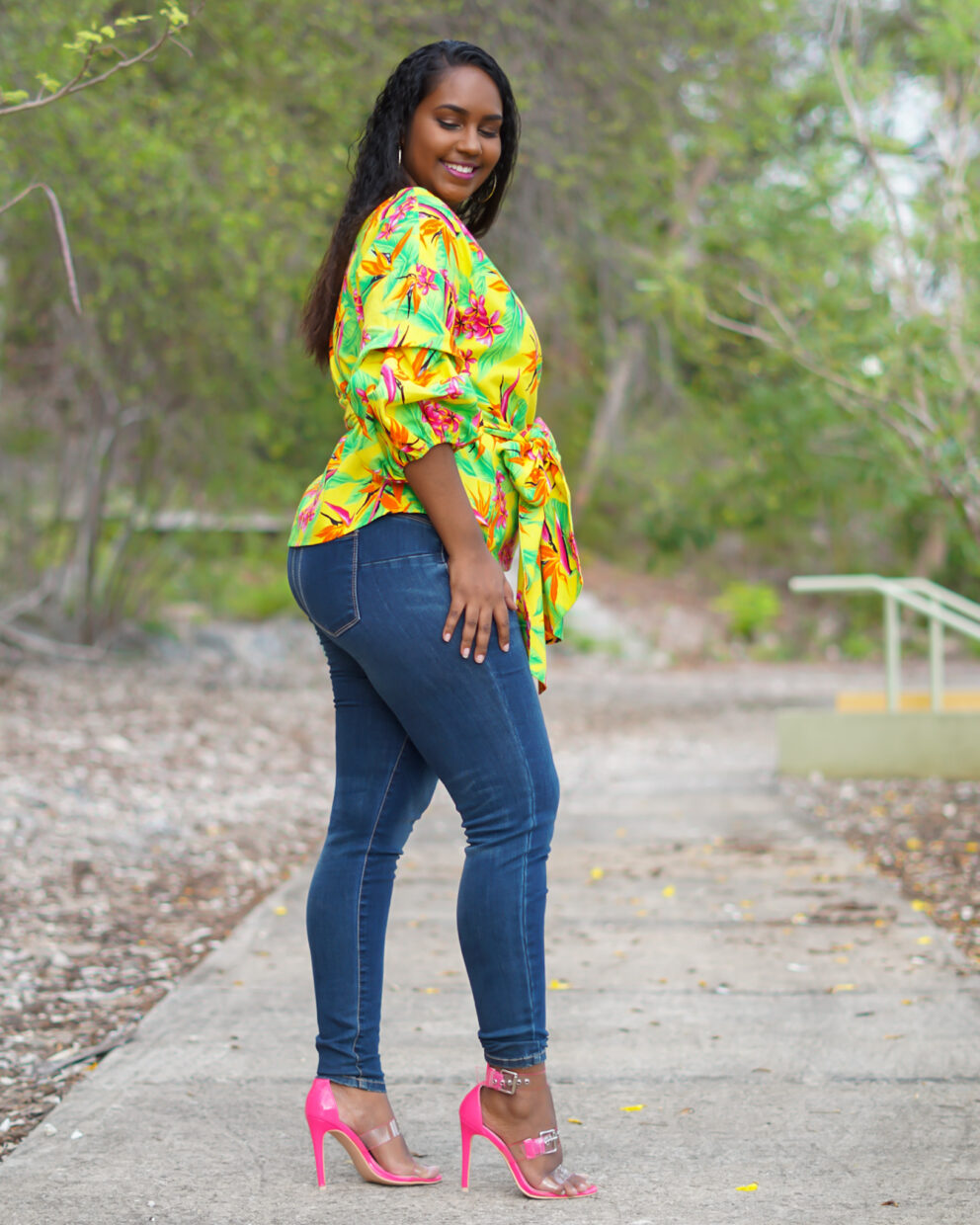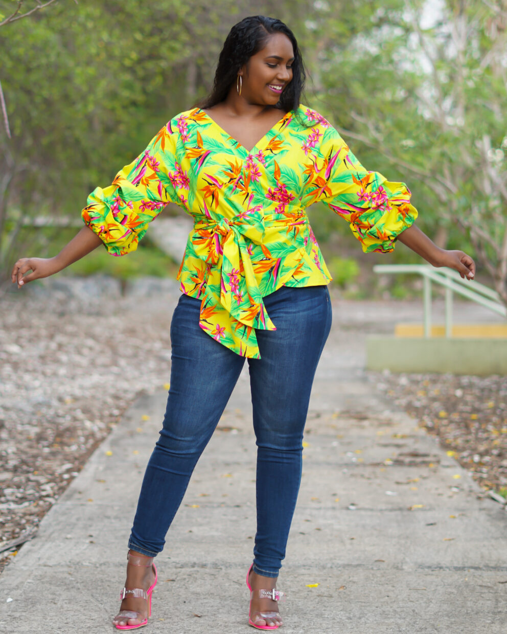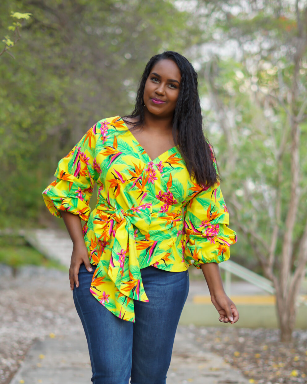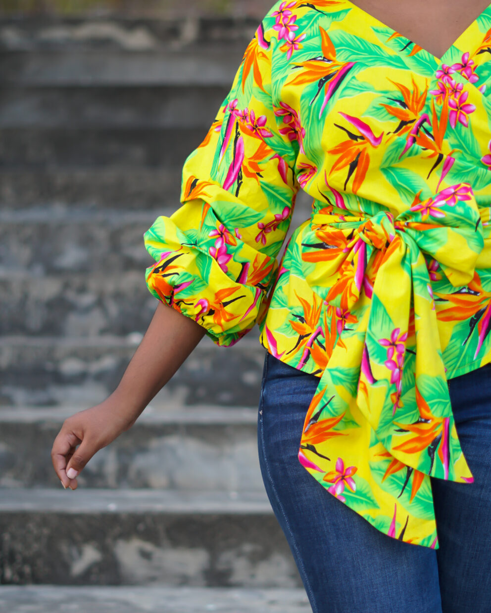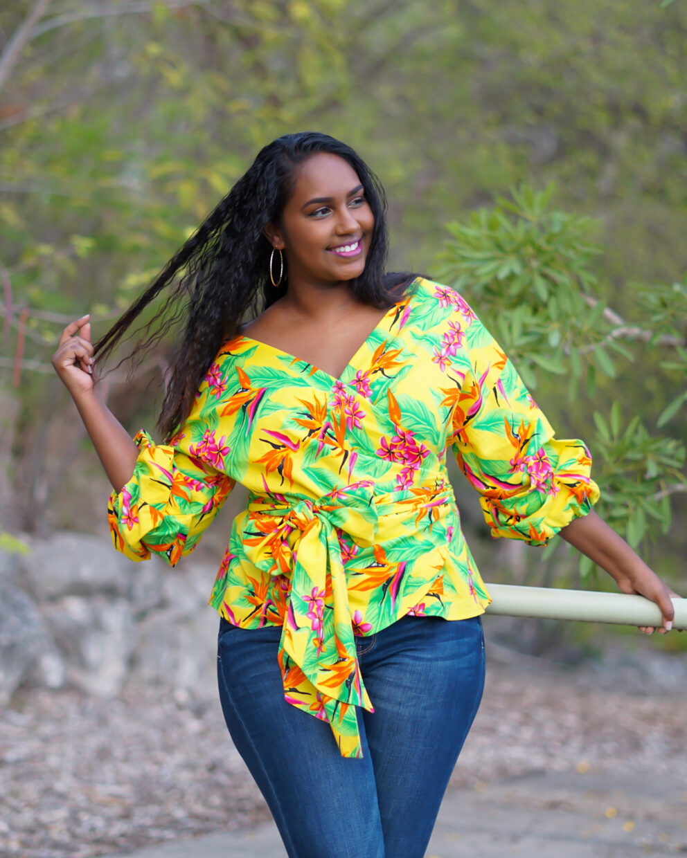My fabric is a tropical print 100% cotton. It is definitely a thicker weight cotton and was the perfect choice to show off these sleeves and the big bow at the front. I guess I picked yellow because I was inspired by the pattern cover. My print is a little busy so I was worried the details could get lost but I think it all works well together. Though I do think a solid would be absolutely stunning and would really draw your eye to those fun details.